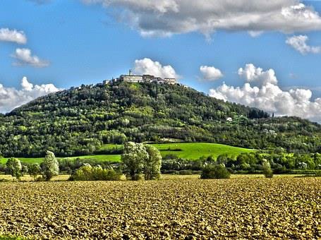 The small town at the top of the hill is surrounded by walls, overlooking the neighboring hills planted with vines and olives, fruit trees, which this area is known from before, and the route